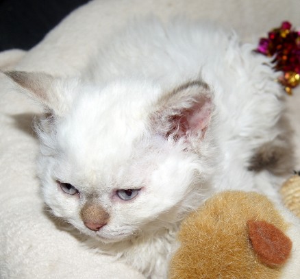 Ronaldo ein süßer Curly trinkt fleißig und ist sehr ruhig.Bin auf die weitere Entwicklung sehr gespannt.Er ist sehr verschmußt und genießt das Graulen am Bauch und schnurrt.Zuckersüß.