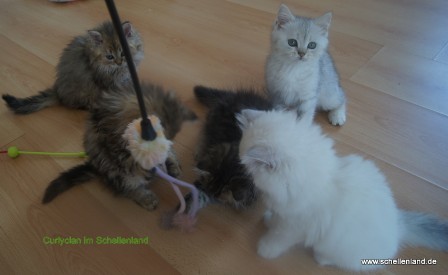 May Lee vom Schellenland hat am 15.04.2014 ihre 4 Katzenbabys ohne Probleme auf die Welt gebracht. Sie sind alle gut vom Gewicht. Es sind ein straight Bube, ein Curlymädchen und zwei Curlybuben. Unsere Süßen sind sehr ruhig und zufrieden. Hier hat der Papa seine Zeichen deutlich gesetzt. Ich freue mich auf die weitere Entwicklung. Unsere Curlybabys laufen in ihren Kittenzimmer mit vielen Spielsachen und Kratzbäumen,wo sie voller Freude alles erkunden. Sie sind alle wieder so süß!