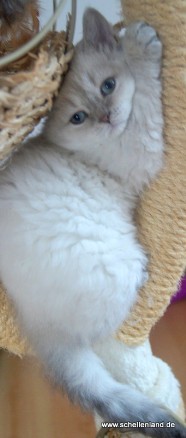 Laticia ist zart, aber klettert schon am Kratzbaum oder Häuschen herum. Klein aber oho, nur zum knuddeln.