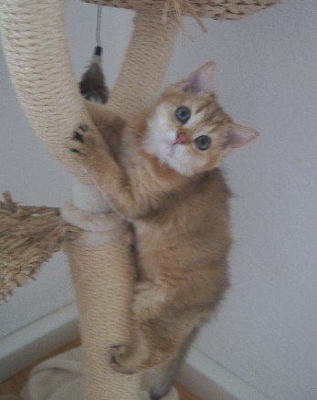 Virginia spielt mit allem,was sie findet und ihr angeboten wird.Und klettern am Kratzbaum ist das Schönste für sie.